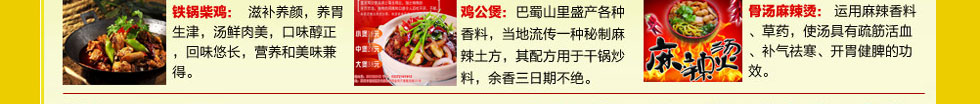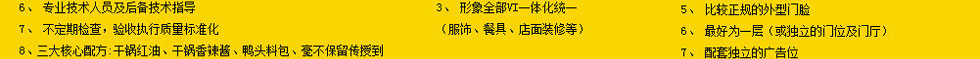 傳授全套秘制底料、秘制紅油、秘制醬料、中草藥香辛料四大核心配方及全套制作方法。 1、品牌授權、授權銅牌、開業資格證書、統一形象設計、加盟店系統管理、營銷秘籍。 2、專業
