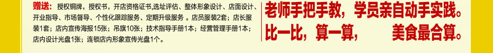 老師上門帶店1-4周;確保連鎖店火爆開業。上門培訓、廚師配送、跟班實操、服務員招聘及培訓、經營成本核算; 3、技術培訓、配方培訓、終身免費技術更新!終身免費營銷管理。